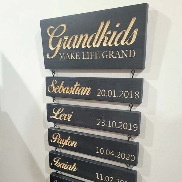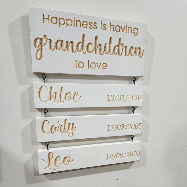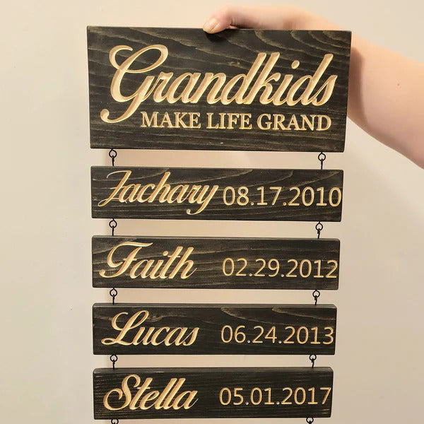 This rustic wood sign will light up your parents or grandparents' eyes as it reveals a sentimental quote with each of their grandchild's names and birthdates hanging. A sentimental gift that will be cherished year after year. The perfect gift for grandparents to memorialize their growing family that is filled with their grandchild and great grandchildren's names. Perfect for your parents with.